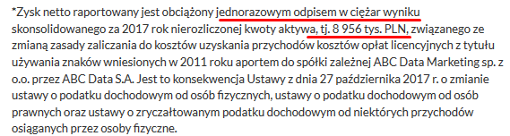 13.04 Abc Data podała szacunki zysku netto za 4 kw 2017 link i zysk netto to 11 mln, wynik wyniósłby 20 mln ale niestety spółka zrobiła jednorazowy odpis (zakładam że księgowy a nie gotówkowy) na 9 mln zł. Mój szacunek zysku wynosił 16 mln ale oczywiście nie uwzględniał żadnych odpisów. Nie ma co narzekać bo istotny wzrost jest marży a widać to po zysku operacyjnym który wzrósł z 14,17 mln do 26 mln (50%). Oczekuję bardzo mocnych wyników za 1 kw 2018 (chyba że znowu jakieś odpisy się pojawią).