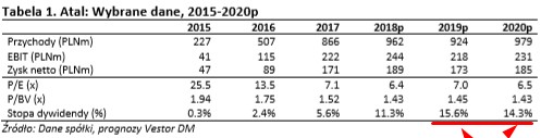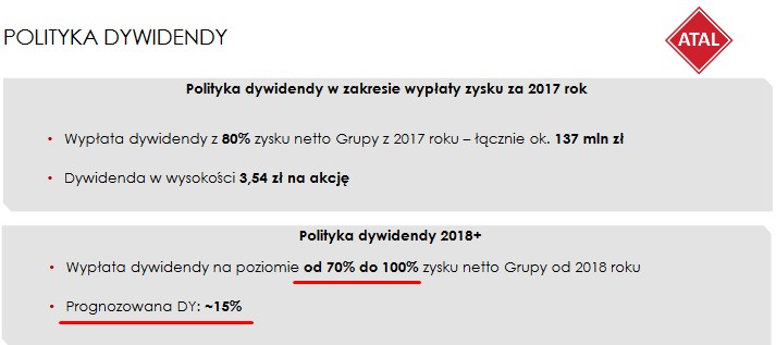 W 2018 roku spółka wypłaciła 80% zysku netto całej Grupy ale padają wstępne deklaracje ze strony prezesa Atalu iż dywidenda za 2018 rok może stanowić nawet 100% zysku netto (w kolejnych latach podobnie ?)