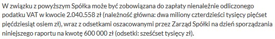 Drugim ryzykiem jest decyzja US iż po kontroli podatku VAT za 2013 rok spółka będzie zobowiązana zapłacić ok. 2,7 mln zaległych podatków z odsetkami.
