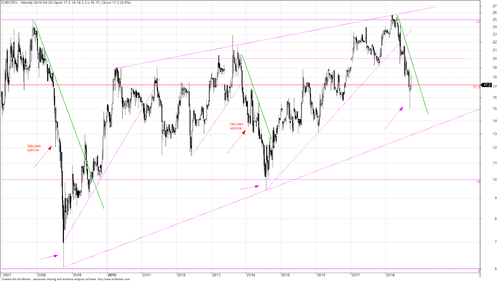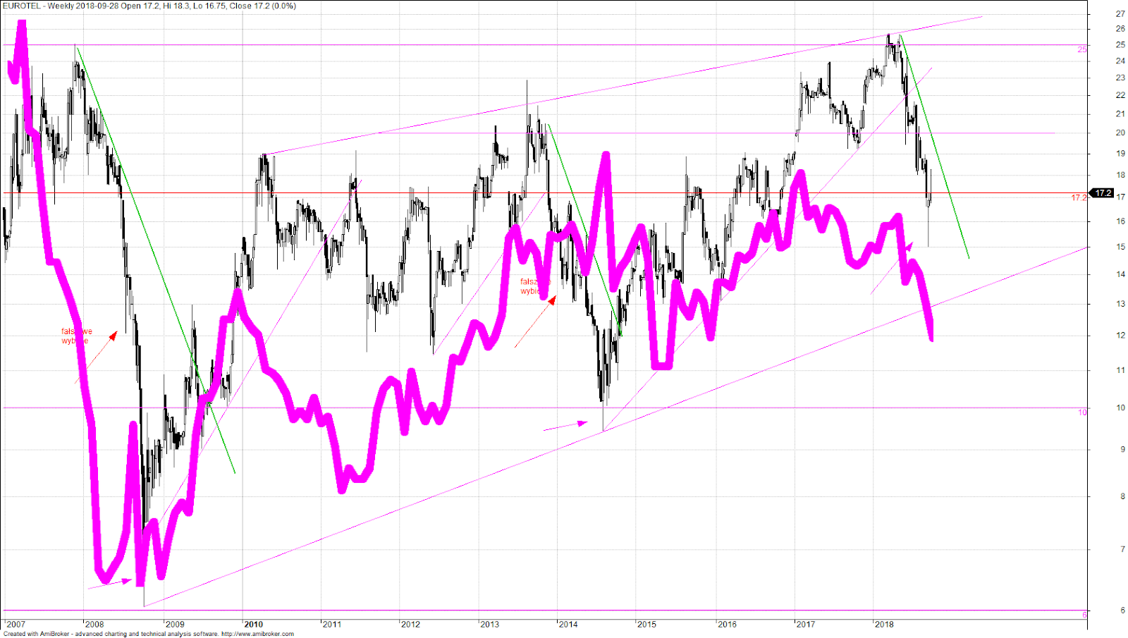 Technicznie wykres Eurotel wygląda ciekawie (są duże różnice na wykresach – jeden bez dywidend, drugi skorygowany o dywidendy – zerknijcie na oba -wykresy maxymalne).