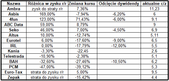 Doskonale tutaj widać iż rynek akcyjny jest obecnie bardzo słaby bo lepsze wyniki r/r i niska wycena (patrząc na wskaźnik c/z) nie uchroniły przed spadkami takich spółek jak Asbis, Altus czy Eurotel, a wszystkie spółki które pokazały gorsze wyniki r/r bardzo mocno spadły.