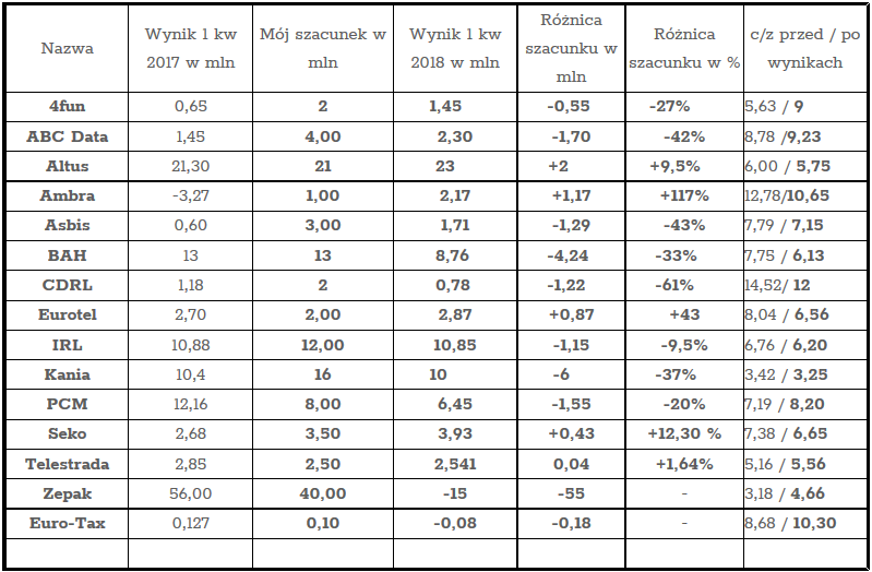Patrząc na powyższą tabelę można łatwo zauważyć że było różnie z tą moją trafnością/przewidywalnością. Były pozytywne zaskoczenia (117% wyższy zysk od moich oczekiwań Ambry) ale i duże negatywne zaskoczenie w przypadku Zepaku w przypadku którego oczekiwałem 40 mln zysku a było aż 15 mln straty. Krótko tłumacząc Zepak i taką dużą rozbieżność to mój szacunek wynikał ze wcześniejszych informacji podawanych przez spółkę iż zamknięcie elektrowni Adamów rocznie wygeneruje około 100 mln niższego zysku Ebidta (czyli 25 mln na kwartał logicznie myśląc), ja dzięki mocnemu wzrostowi cen energii w 1 kw przyjąłem że zysk będzie niższy tylko o 16 mln a faktyczny był niższy aż o 71 mln (w zasadzie w jednym kwartale zrealizowali całoroczny spadek zysku). Analizując dalej tabelę rzuca się w oczy negatywny fakt a mianowicie większość wyników była gorsza od moich szacunków choć co pozytywne lepsze były od tych rok wcześniej. Wynika to z tego iż oczekiwałem poprawy wyników dzięki korzystnym walutom, surowcom czy nawet otoczeniu w którym działają, jednak nie doszacowałem rosnących kosztów prowadzonej działalności (głównie wzrost wynagrodzeń). Spółką która mnie najbardziej pozytywnie zaskoczyła to Eurotel w którego przypadku liczyłem na spadek zysku ze względu na wysoka bazę (rok temu były ogólnopolska akcja rejestrowania kart Pre-paid). Z kolei Asbis to spółka która mnie najbardziej zawiodła. Pokazał on ponad 50% wzrost przychodów, liczyłem że utrzymując marże z 4 kw 2017 które (i tak były najniższe w całym 2017 roku) pokaże świetne wyniki, jednak tak się nie stało, marże spadły i były zdecydowanie niższe niż rok wcześniej (słabo to wróży marżom na dalszą część roku).