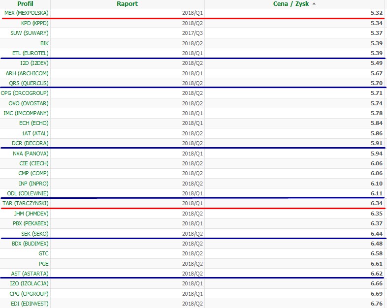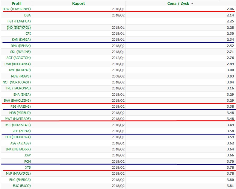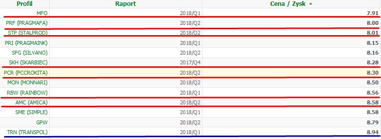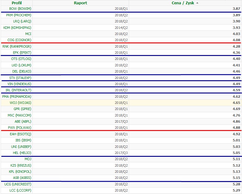 Na powyższej liście spółek (ze wskaźnikiem c/z pomiędzy 2-9) zaznaczyłem czerwoną linią spółki warte wg mnie uwagi a niebieską linią spółki które mam lub miałem w ostatnim roku w portfelu.
