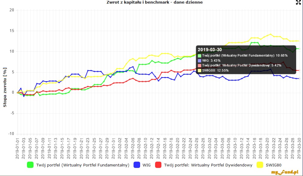 Pierwszy kwartał 2019 roku był nadspodziewanie dobrym dla polskich i światowych giełd. Trzeba przyznać że ostatnie miesiące to ogromne wręcz wahania indeksów gdyż z końcem ubiegłego roku indeksy w USA weszły w bessę (ponad 20% spadku od szczytu) a obecnie ponownie są w hossie gdyż od grudniowych dołków wzrosły ponad 20%. W mijającym kwartale Wirtualny Portfel Fundamentalny zyskał 10,20% a Wirtualny Portfel Dywidendowy zyskał 5,90%.