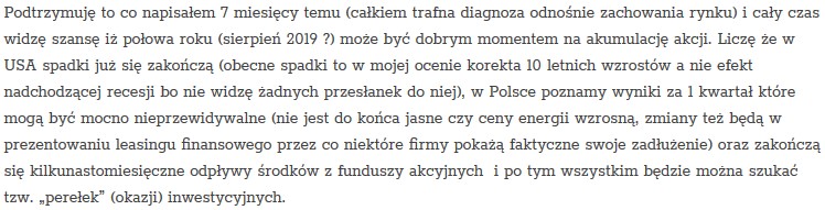 Obecnie dla mnie ważniejsza jest przyszłość (której nikt nie zna :-) Oczywiście każdy może mieć swoje oczekiwania a moje są lekko negatywne. Doskonale widać że na GPW brakuje kapitału a w ostatnim czasie polskie indeksy zanotowały minimalne wzrosty przy dużych w USA (bardzo duża dysproporcja). Mam wrażenie że w najbliższych tygodniach WIG20 i WIG mogą mocniej runąć w dół (obym się mylił). Powodów tego poza brakiem kapitału mogą być oczekiwane przeze mnie słabsze publikowane wyniki spółek za 1 kwartał 2019 (zaczną obowiązywać znacznie wyższe ceny energii) oraz powrót tematu likwidacji OFE. W dniu wczorajszym polski rząd zapowiedział że do wyborów chce dokonać ostatecznego zamknięcia OFE a to na pewno wprowadzi nerwowość i spadki na najbardziej narażonych na likwidację OFE spółkach. Z zagranicznych tematów coraz mocniej straszy bezumowny Brexit który na chwilę obecną jest coraz bliżej i jeśli do niego dojdzie należy się spodziewać krótkotrwałych ale mocnych spadków indeksów.