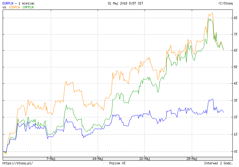 O tym że obecne spadki to „poważniejsza sprawa” świadczy mocne osłabienie polskiej waluty. W miesiąc kurs eur/pln wzrósł o 2% ale kursy usd/pln i chf/pln wzrosły 6-7%. Zazwyczaj takie wzrosty wskazują iż kapitał zagraniczny wycofuje się z polskiego rynku.