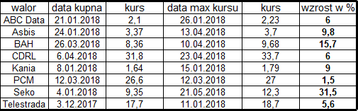 Poniżej zamieszczam tabelkę aby pokazać ile maksymalnie kursy rosły po moim pierwszym kupnie, gdybym (teraz to można sobie gdybać) sprzedał je na maksymalnych poziomach wynik byłby zupełnie inny.
