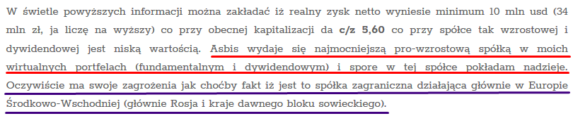 Dziwnie kurs Asbisu ostatnio się zachowuje gdyż przybliżone wyniki w zasadzie „były znane już wcześniej” dzięki podniesionej 31.10.2018 r. przez Zarząd prognozie przychodów i zysków link a rynek jakby temu nie dowierzał. Muszę przyznać że zazwyczaj jest „gra” pod dobre wyniki a tutaj było odwrotnie, kurs spadał przed i mocno wzrósł po wynikach. Czytaj dalej „Asbis – niejednoznaczne wyniki ale obecna wycena niska”