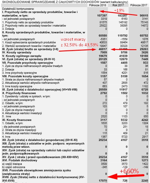 Pokuszę się jeszcze tak jak mam w zwyczaju o szacunek zysku za 3 kw oraz cały 2018 rok. Zakładając iż przychody się nie zmienią (choć spokojnie można zakładać 10% wzrost) a marża wyniesie 40% (niższa niż obecnie) to w 3 kw 2018 zysk może wynieść 3,5 mln przy 0,7 mln rok temu (wzrost o 400%) a w 4 kw ok. 1,5 mln przy 2 mln straty rok wcześniej. Pragnę zwrócić uwagę iż w 4 kw spółka wykazała ok. 2 mln strat z różnic kursowych związanych z dynamicznym niekorzystnym umocnieniem złotego do euro oraz naliczyła wyższy podatek dochodowy niż normalnie. Patrząc na wyniki pierwszego półrocza to moje szacunki są niskie ale podchodzę w przypadku tej spółki trochę zachowawczo. Gdyby moje szacunki się sprawdziły to roczny zysk wyniósłby 22 mln a c/z spadłaby do 2,30 !!!