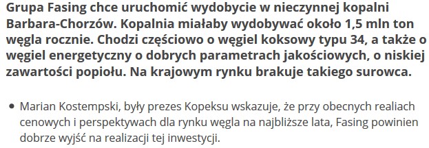 Nie jestem w stanie ocenić jakie Fasing może osiągnąć zyski gdyby wznowił wydobycie węgla w kopalni ale wydaje się że spore. Ruch ten z pewnością przeniósłby do wyższej „ligi” postrzegania spółki przez inwestorów i analityków. Należy też zakładać iż początkowe koszty uruchomienia mogą być ogromne (kilkadziesiąt milionów?) ale wydaje się że nie powinno być problemów z pozyskaniem takiego finansowania e środków własnych i kredytów inwestycyjnych.