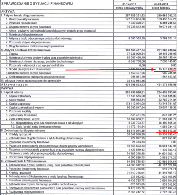 O prawdopodobnych świetnych wynikach w 2 kw 2018 świadczą wstępne wyniki po 4 miesiącach które firma wykazała w dokumencie planu połączenia ze spółką zależną link, z których wynika że w samym kwietniu zarobili 2,5 mln netto (taki zysk wyniósł w całym 2 kw 2017) przy przychodach 26,5 mln (65 mln w całym 2 kw 2017). Ponadto mocno poprawiła się pozycja gotówkowa gdyż gotówka wzrosła o ok. 10 mln a spadły należności i zobowiązania.