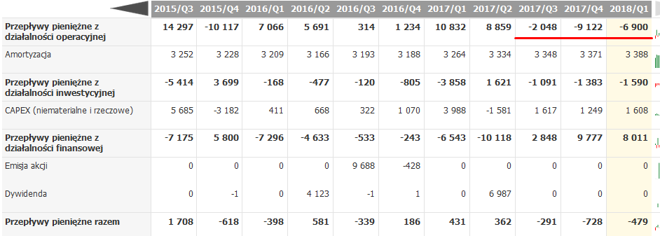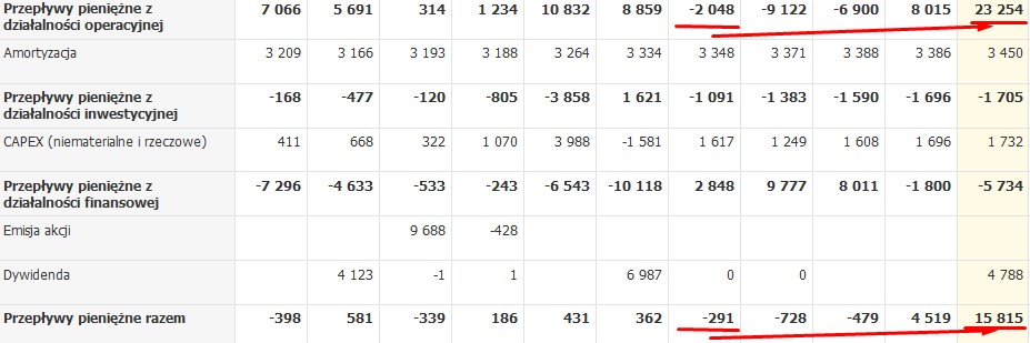 Oczywiście należy też wspomnieć o ryzykach (to chyba najważniejsze) jakie ma spółka, czyli nie do końca zażegnany konflikt ze spółką ZM Invest (jeszcze udziałowiec i jeden z głównych kooperantów spółki), trwające sprawy sądowe ze skarbówką (na chwilę obecną wygrywane przez spółkę) i możliwa „zemsta” skarbówki która może swoim dodatkowymi kontrolami (jedna obecnie trwa w spółce) mocno uprzykrzyć działalność (o tym wszystkim można przeczytać w raportach kwartalnych i rocznym, należy też przeczytać opinię biegłego z raportu rocznego). Ze strony finansowej należy też zwrócić uwagę na przepływy operacyjne które przez trzy ostatnie kwartały były ujemne i gdyby trwało to dłużej będzie to niebezpieczne dla spółki (problemy z płynnością).