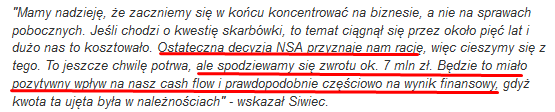 5 czerwca 2018r. spółka poinformowała o korzystnym wyroku NSA link wg którego spółka ma szansę odzyskać około 7 mln.