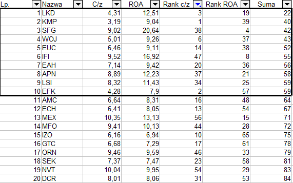 Uwaga – prawidłowo do testu nie powinny wejść spółki Lokum, Kompap i Efekt gdyż mają c/z poniżej 5, jednak ja je dołączyłem gdyż w tych spółkach nie ma nic nietypowego a niskie wyceny są wynikiem raczej słabości rynku.